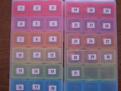 お薬ボックス。 100円ショップにあった。ピルケース。 これが一番沢山だった。他のは3食後用とか、一週間分とか。 これも中途半端。21日分しかケースがない。なので、ふたあつ買いました(゚×゚*)プッ そして、日付を作りまして、はい、一ヶ月分。 朝、薬を飲んで、カレンダーに丸して、「はい、飲みました。」ってしてたんだけどね。 丸するのを忘れると、頭では飲んだのに、(-_-)ウームってな事を考えたりするのだ。 お馬鹿さんなのだ。 で、これを作りました。ご老人向けに…こういうのカレンダーみたいのであるのだ。 忘れないようにって。薬がはいるぽっけがついてるカレンダーみたいの。 それと一緒だな。 まあ、こんなのが欲しかっただけ。えへへo(- -;*)ゞ 何か、かわゆいでしょ。 あれ、面倒臭い感もありますか? いや、でもね、これ、旅行なんかの時は便利だぞ。なんて、旅行なんていかないけど。